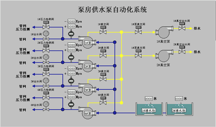 通過西門子SMART200PLC控制每個(gè)濾池的自動(dòng)工作,由工業(yè)交換機(jī)組成以太網(wǎng)系統(tǒng)。主控制室由研華工控機(jī)安裝力控網(wǎng)絡(luò)版組態(tài)軟件,實(shí)際對各個(gè)濾池工作狀態(tài)的遠(yuǎn)程監(jiān)控。計(jì)時(shí)反沖、定時(shí)反沖相結(jié)合,保證水廠產(chǎn)水的各項(xiàng)需要,生產(chǎn)數(shù)據(jù)設(shè)定好后,無需人為參與。